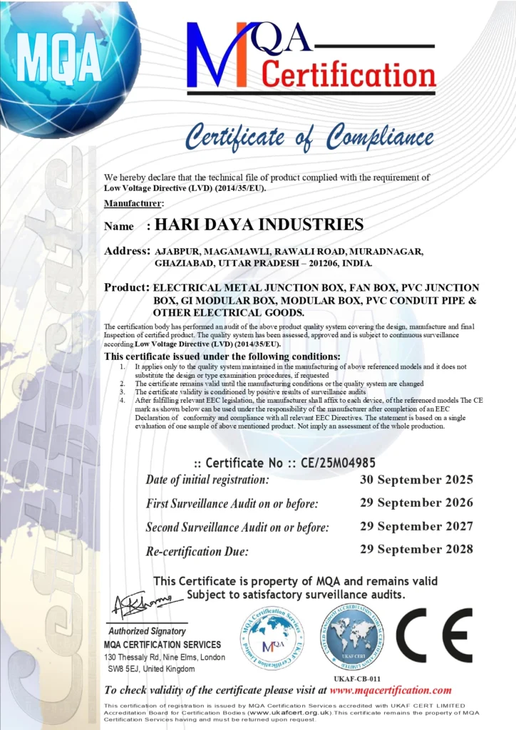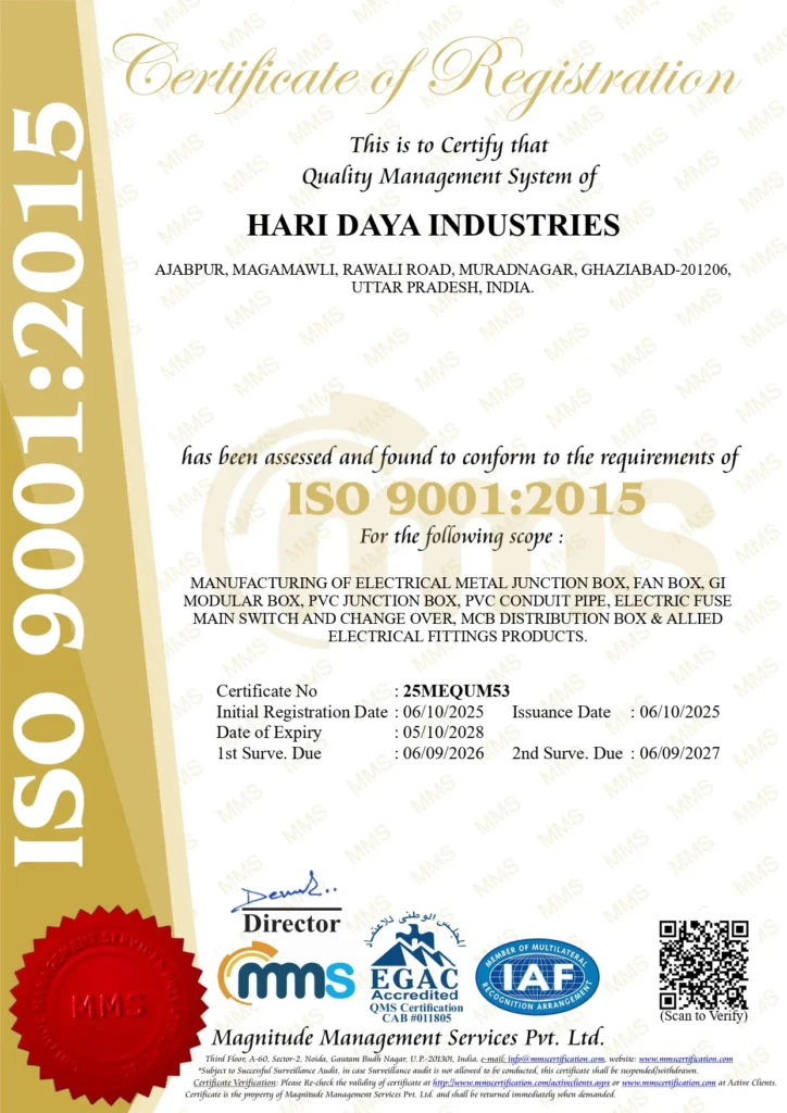 Established in 2011, Haridaya Industries manufactures electrical boxes under the ‘KISAAN ELECTRIC’ brand, including Modular, Fan, Concealed, and MCB Distribution Boxes.